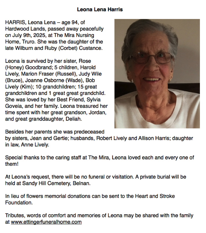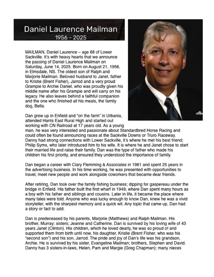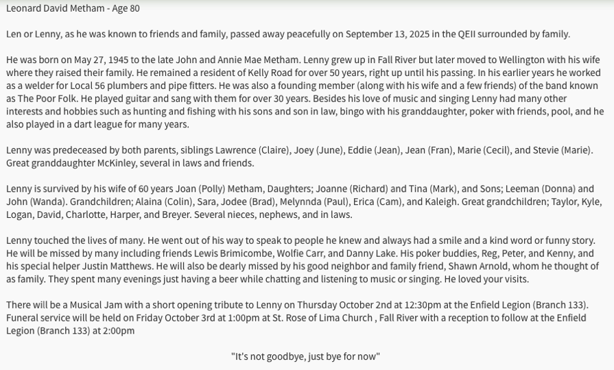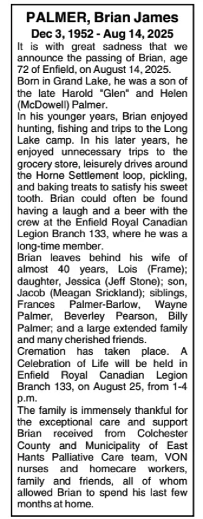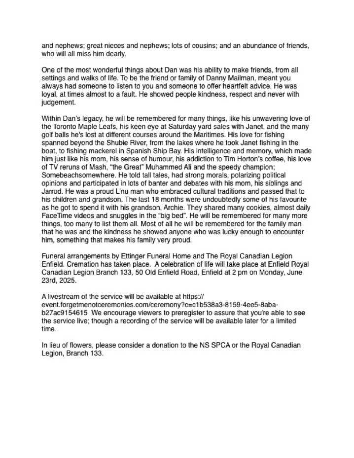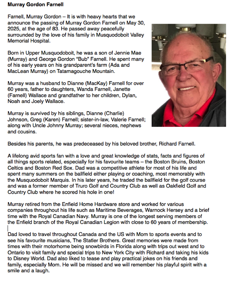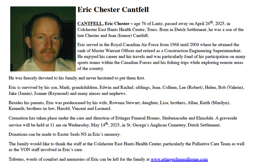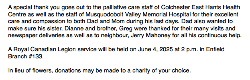 Cremation has taken place. A Legion Funeral Service will be held at the Royal Canadian Legion Branch 133 Enfield on Wednesday August 23rd, 2023 at 2:00pm. There will be a reception immediately following the service from 2:30-4:00pm.