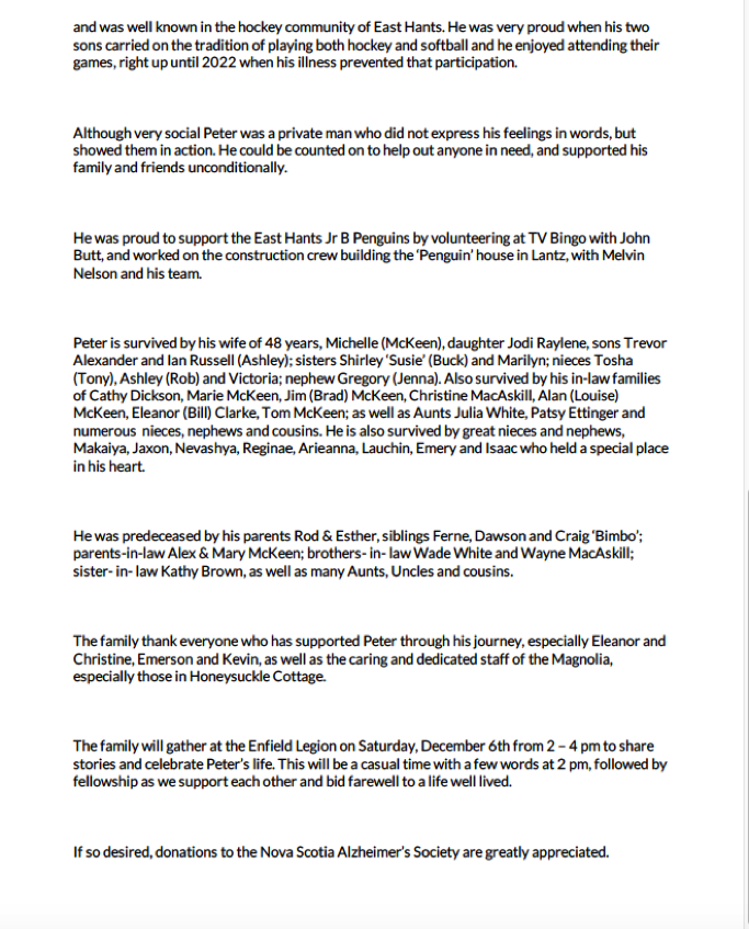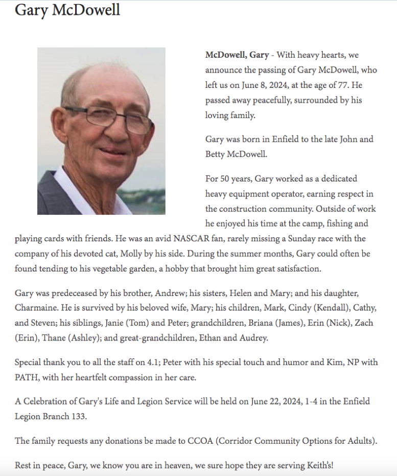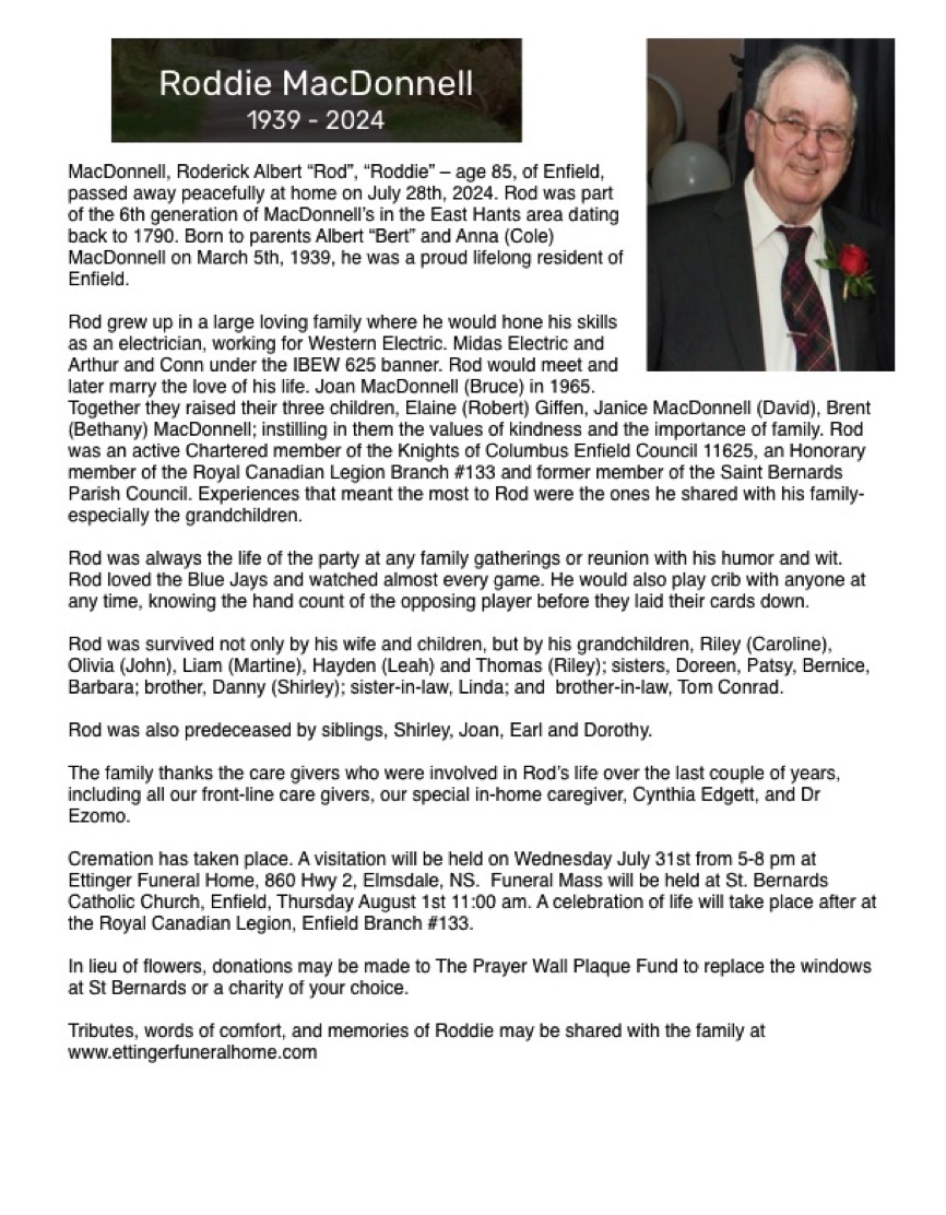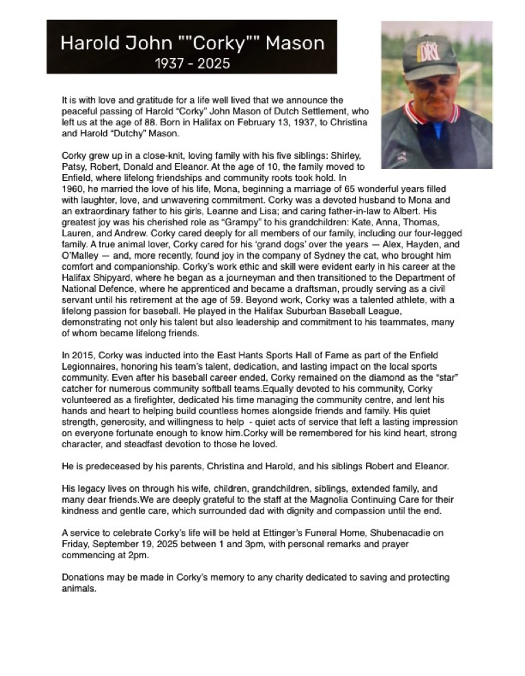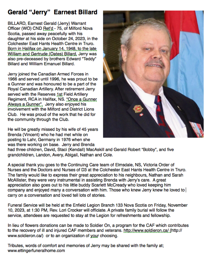 Cremation has taken place. A Legion Funeral Service will be held at the Royal Canadian Legion Branch 133 Enfield on Wednesday August 23rd, 2023 at 2:00pm. There will be a reception immediately following the service from 2:30-4:00pm.