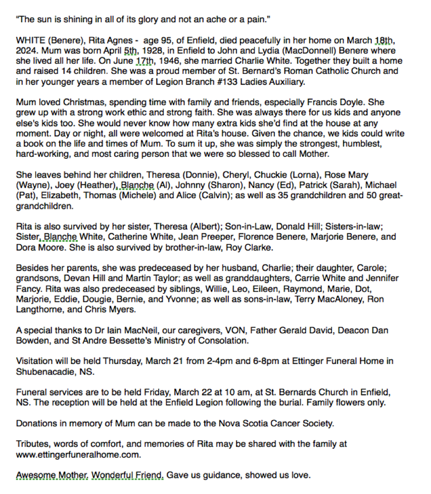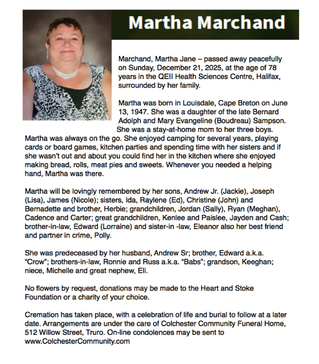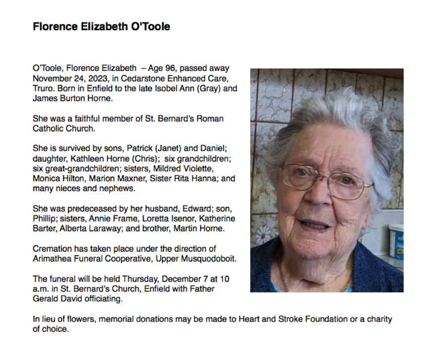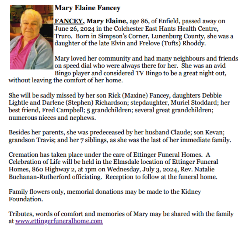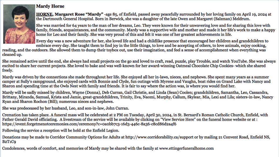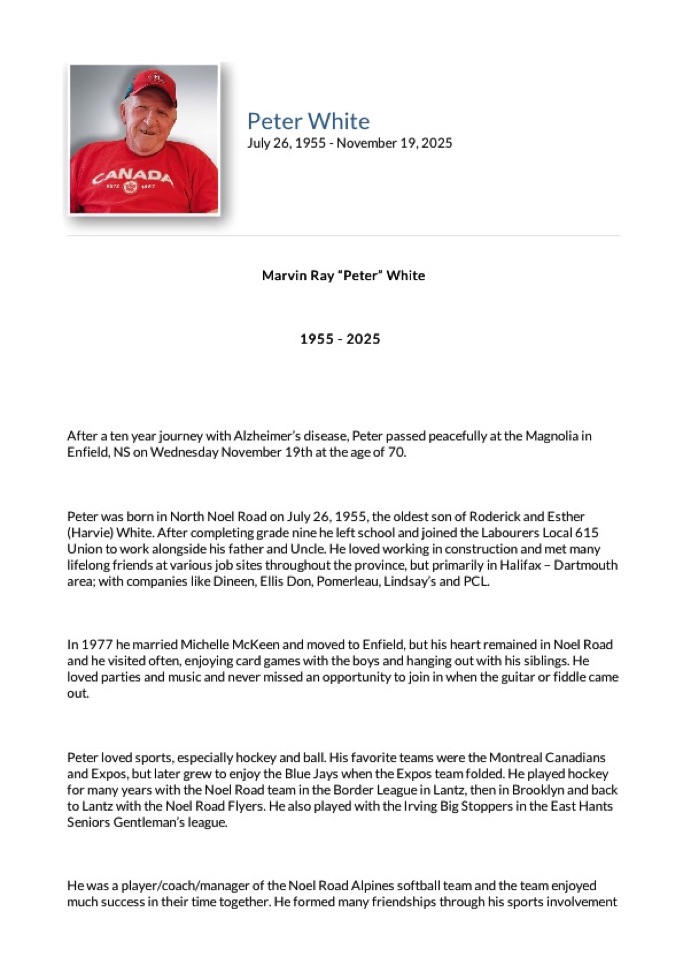 Cremation has taken place. A Legion Funeral Service will be held at the Royal Canadian Legion Branch 133 Enfield on Wednesday August 23rd, 2023 at 2:00pm. There will be a reception immediately following the service from 2:30-4:00pm.