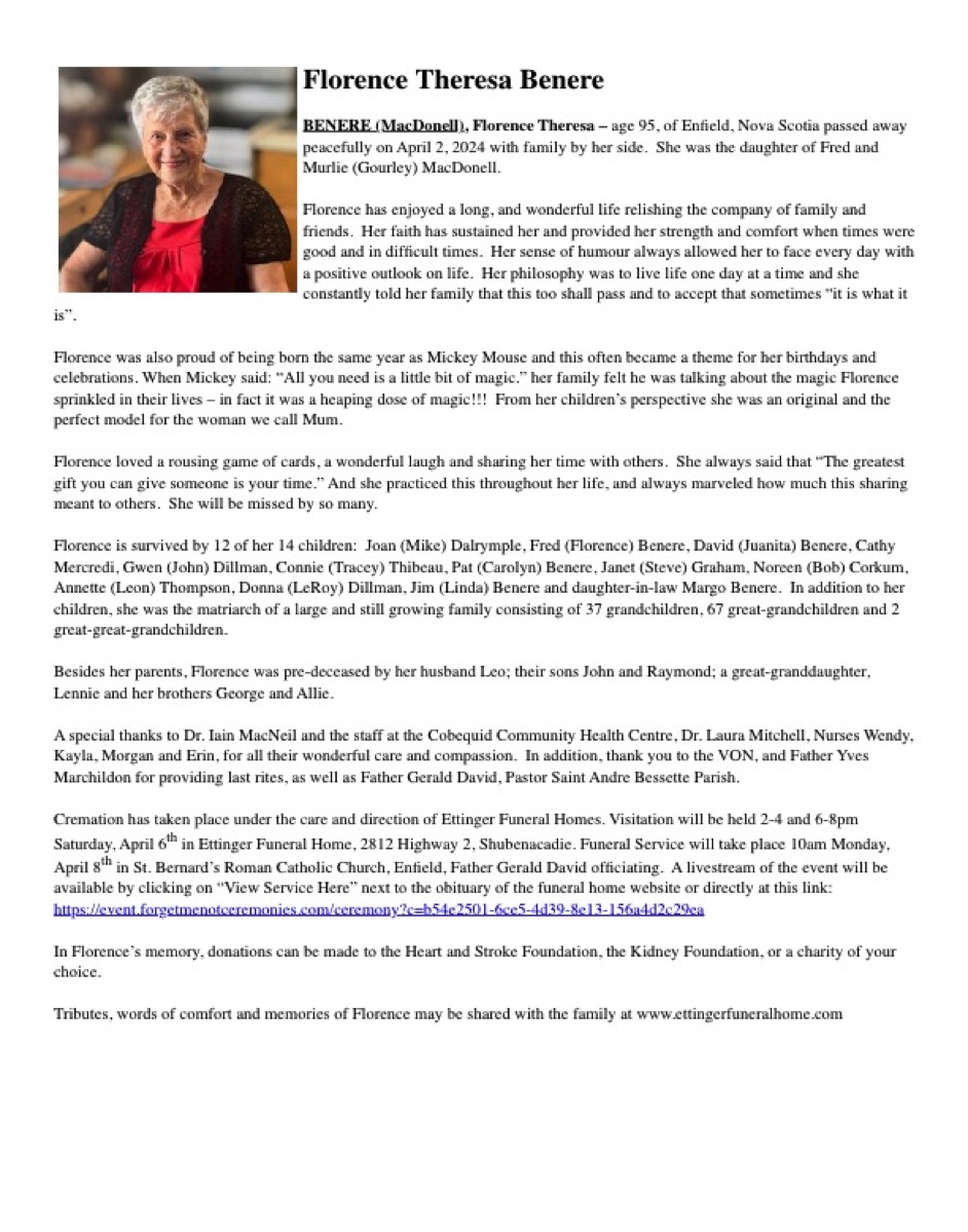 BENERE, Raymond Francis – 69, Elmsdale, Nova Scotia passed away at home on Thursday, August 17, 2023. He was the son of Florence (MacDonell) and the late Leo Benere.