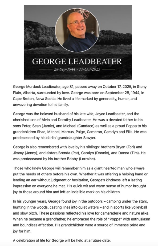 Raymond’s family would like to extend a sincere thank you to the many healthcare professionals who supported him over the years. To honour Raymond, we encourage you to take the time to connect with those you love. Tributes, words of comfort and memories of Raymond may be shared with the family at www.ettingerfuneralhome.com.